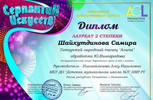 Шайхутдинова Самира - Лауреат II степени (кл.преп-ля Нигматзяновой А.Н);