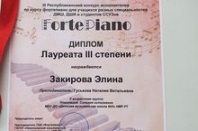 10 апреля, учащаяся вокального отдела "Детской музыкальной школы №5" - Закирова Элина (кл.преп-ля Гуськовой Н.В) отлично выступила и стала Лауреатом III степени в III Республиканском конкурсе исполнителей по курсу фортепиано для учащихся разных специальностей ДМШ, ДШИ и студентов ССУЗов "FortePiano" г.Камские Поляны.