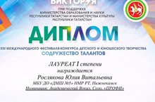 Поздравляем преподавателя по классу вокала и хора "Детской музыкальной школы №5" - Рослякову Юлию Витальевну, которая стала Лауреатом I степени на Международном фестивале-конкурсе детского и юношеского творчества "Содружество талантов" г.Казань.
