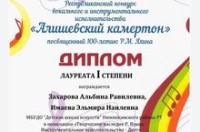 Камерный ансамбль в составе Сафонова Ивана и Муллаяновой Линетты (кл.преп-ля Гильфановой Г.Т , Аннаевой Г.М) - Лауреат II степени.