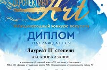 30 ноября, учащаяся вокального отдела "Детской музыкальной школы №5" - Хасанова Азалия (кл.преп-ля Росляковой Ю.В) отлично выступила и стала Лауреатом III степени в Международном конкурсе искусств "Art- перспектива" г Казань.