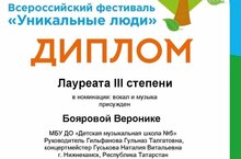 Поздравляем учащуюся оркестрового отдела "Детской музыкальной школы №5" Боярову Веронику (кл.преп-ля Гильфановой Г. Т, концертмейстер Гуськовой Н. В), которая отлично выступила и стала Лауреатом III степени во Всероссийском фестивале "Уникальные люди" г. Иваново.