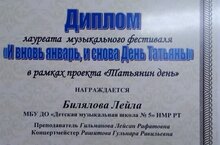 25 января ученица преподавателя Гильмановой Л. Р. Билялова Лейла и преподаватель Рашитова Г. Р. приняли участие в музыкальном фестивале "И вновь январь и снова День Татьяны" который прошёл в ДМШ №2.