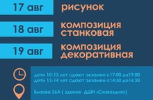 ВНИМАНИЕ! ИНФОРМАЦИЯ ДЛЯ ПОСТУПАЮЩИХ В МАУ ДО «ДХШ №1» НМР РТ! Допуском к вступительным экзаменам является наличие заявления, поданного одним из родителей в электронном виде и наличие полного пакета документов, представленных в приемную школы на бумажном носителе: - заявление; - фото ребёнка 3*4 (1 шт.); -копия свидетельства о рождении ребёнка; - копия ИНН ребенка; - копия СНИЛС ребёнка; - медицинская справка о состоянии здоровья ребёнка от участкового терапевта; - папка скоросшиватель с прозрачной обложкой; - файлы 4-5 шт. Поступающие сдают 3 экзамена: Первый день: РИСУНОК Второй день: КОМПОЗИЦИЯ СТАНКОВАЯ Третий день: КОМПОЗИЦИЯ ДЕКОРАТИВНАЯ Наличие всех трёх экзаменов дает право на поступление в ДХШ №1. В связи с проведением капитального ремонта здания школы вступительные экзамены состоятся 17, 18,19 августа 2020 года, по адресу ул. Бызова 26 А (здание ДШИ «Созвездие»). Дети в возрасте 10 - 13 лет сдают экзамен с 17:00 до 19:00 Дети в возрасте 13 -14 лет сдают экзамен с14:30 до 16:30 Вступительные испытания по дополнительным предпрофессиональным программам. По учебному предмету «РИСУНОК»: Задание №1. Изображение заданного натюрморта графическими средствами (ИМЕТЬ ПРИ СЕБЕ: бумагу формата А-4, графитные карандаши различной мягкости, малярный скотч, планшет с зажимом. По учебному предмету «КОМПОЗИЦИЯ СТАНКОВАЯ»: Задание №2. Исполнение сюжетной композиции на заданную тему (ИМЕТЬ ПРИ СЕБЕ: формат А-4, акварельные краски или гуашь, кисти, ёмкость для воды, малярный скотч, планшет с зажимом. По учебному предмету «КОМПОЗИЦИЯ ДЕКОРАТИВНАЯ»: Задание №3. Исполнение декоративной композиции на заданную тему (ИМЕТЬ ПРИ СЕБЕ формат А-4, цветные карандаши, фломастеры, гелевые ручки, малярный скотч, планшет с зажимом. 12.08.2020
