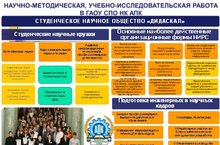 Студенческое научное общество «Дидаскал» ГАПОУ «Нижнекамский агропромышленный колледж» стало лучшей студенческой научной организацией г.Нижнекамска. На ежегодной церемонии награждения победителей ежегодной студенческой премии Нижнекамского муниципального района «Студент года-2014», проводимой ММОО «Нижнекамский Союз студентов» при поддержке МБУ «Управление по делам молодежи и спорту» исполнительного комитета Нижнекамского муниципального района РТ, колледж получил диплом «Лучшая студенческая научная организация-2014». Это результат огромной работы научно-методической службы колледжа, руководителей научных кружков СНО «Дидаскал», Совета студентов НК АПК.