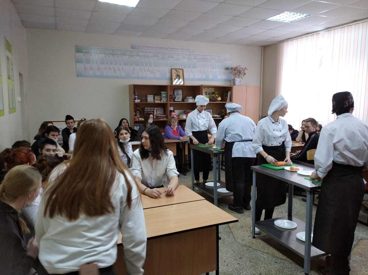 Опубликовано: 28.01.2022В рамках профессиональной декады группы технологов 12 и 13 участвовали в конкурсе профмастерства, где определился победитель-лучший по нарезке овощей Азиз Валеев. Так же ребята познакомились со сложными формами нарезки. Были продемонстрированы приёмы по изготовлению украшений из овощей и фруктов.