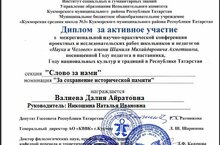 Валиева Далия – студентка 2 курса была награждена дипломом в номинации «За сохранение исторической памяти» (Руководитель: Никошина Н.И.).