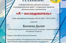 Студентка группы 448 Валиева Далия под руководством преподавателя Евстифеевой Юлии Анатольевны заняла 1 место в VI-ом Всероссийском детском конкурсе исследовательских работ и творческих проектов дошкольников и школьников "Я исследователь"