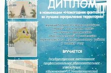 По результатам участия в муниципальном смотре-конкурсе "Новый год в моем окне" на лучшее оформление образовательной организации Ниднекамского муниципального района к Новому Году колледж победил в номинации "Новогодяя фантазия"