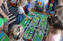 В течении всей недели каждое утро с детьми проводились беседы: «Светофор-наш друг», «Устройство проезжей части», «Где можно играть», «Правила дорожного движения выполнять без возражения».