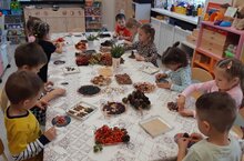 Дети больше всего радуются яркому украшению зала, дарам осени, желтым и красным листьям.