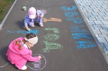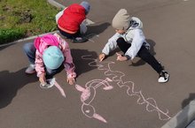 Ребята своих перелётных птиц нарисовали на асфальте, а потом на участке нашли пёрышки, с которыми провели опыты. -
