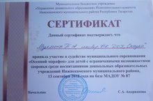 Инструктор по ФК нашего ДОУ Муллина Татьяна Анатольевна приняла участие в судействе миниципального соревнования "Осенний марафон" для детей с ограниченными возможностями здоровья среди воспитанников ДОУ НМР, который состоялся на базе д/с№ 87.