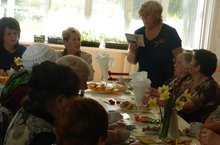 После концерта ветераны труда прогимназии, за чашкой чая, с вкусными пирогами, тепло пообщались, поделились приятными событиями, произошедшими в семьях за последнее время. Зинаида Гавриловна Валанкина, проработавшая старшим воспитателем с основания "Сказки", с гордостью прочла стихотворение о ВОВ своей внучки Надежды, растрогав до слёз многих присутствующих. С этим стихотворением внучка в Республиканском конкурсе заняла 3 место.