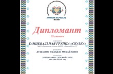 Порадовались результатами международного детского и юношеского итнернет-конкурса "Зимняя карусель". Танцевальная группа "СКАЗКА" под руководством хореографа прогимназии Кузьминой Н.М. стала ДИПЛОМАНТОМ III степени. УРА! МОЛОДЦЫ!