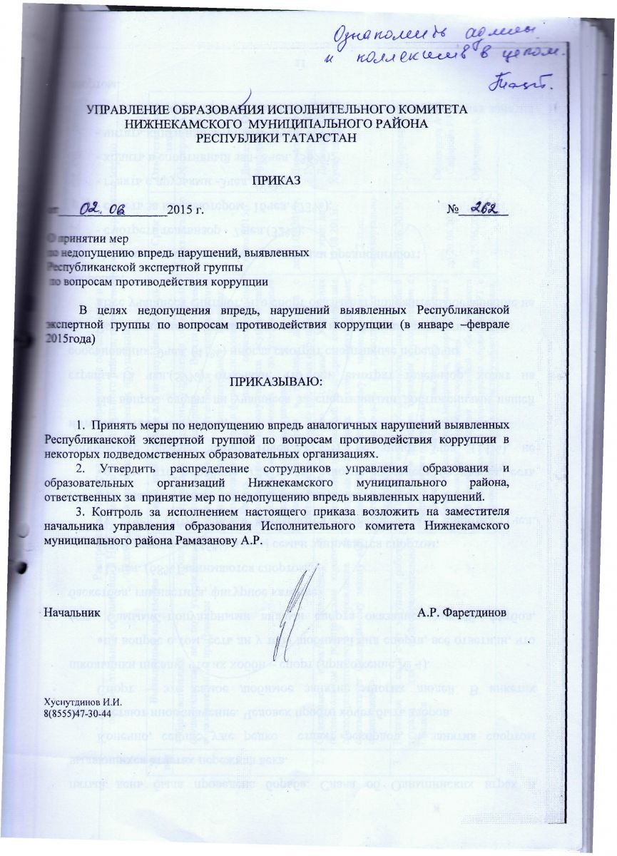 Распоряжение о составе комиссии УО Исполнительного комитета НМР РТ по противодействию коррупции