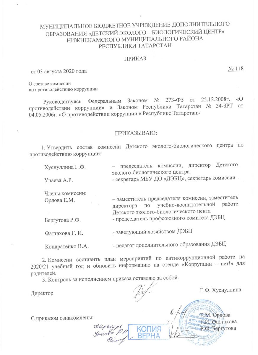Приказ ДЭБЦ о составе комиссии по противодействию коррупции