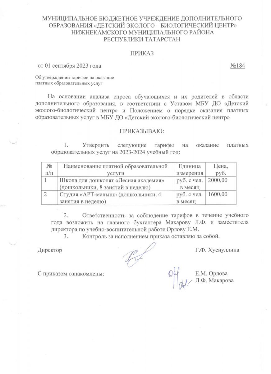 Приказ об утверждении тарифов на оказание платных образовательных услуг 2023