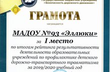 По итогам рейтинга результативности деятельности образовательных учреждений по профилактике детского дорожно-транспортного травматизма за 2019/2020 учебный год наш детский сад занял l место.