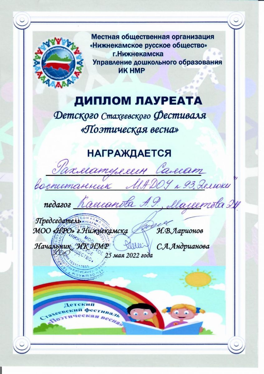 23 мая в Доме Дружбы народов прошёл детский Стахеевский фестиваль "Поэтическая весна", посвященный Году культурного наследия народов России. Из нашего детского сада принял участие Рахматуллин Самат .