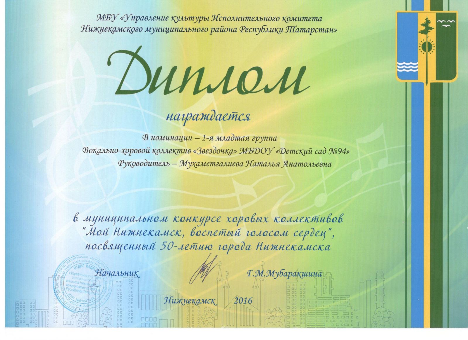 За участие в муниципальном конкурсе хоровых коллективов "Мой Нижнекамск, воспетый голосом сердец", посвящённый 50-летию города Нижнекамска в номинации - 1-я младшая группа, был награждён дипломом вокально - хоровой коллектив "Звёздочка" МБДОУ "Детский сад №94 "Соенеч" и его руководитель - Муртазина Наталья Анатольевна.