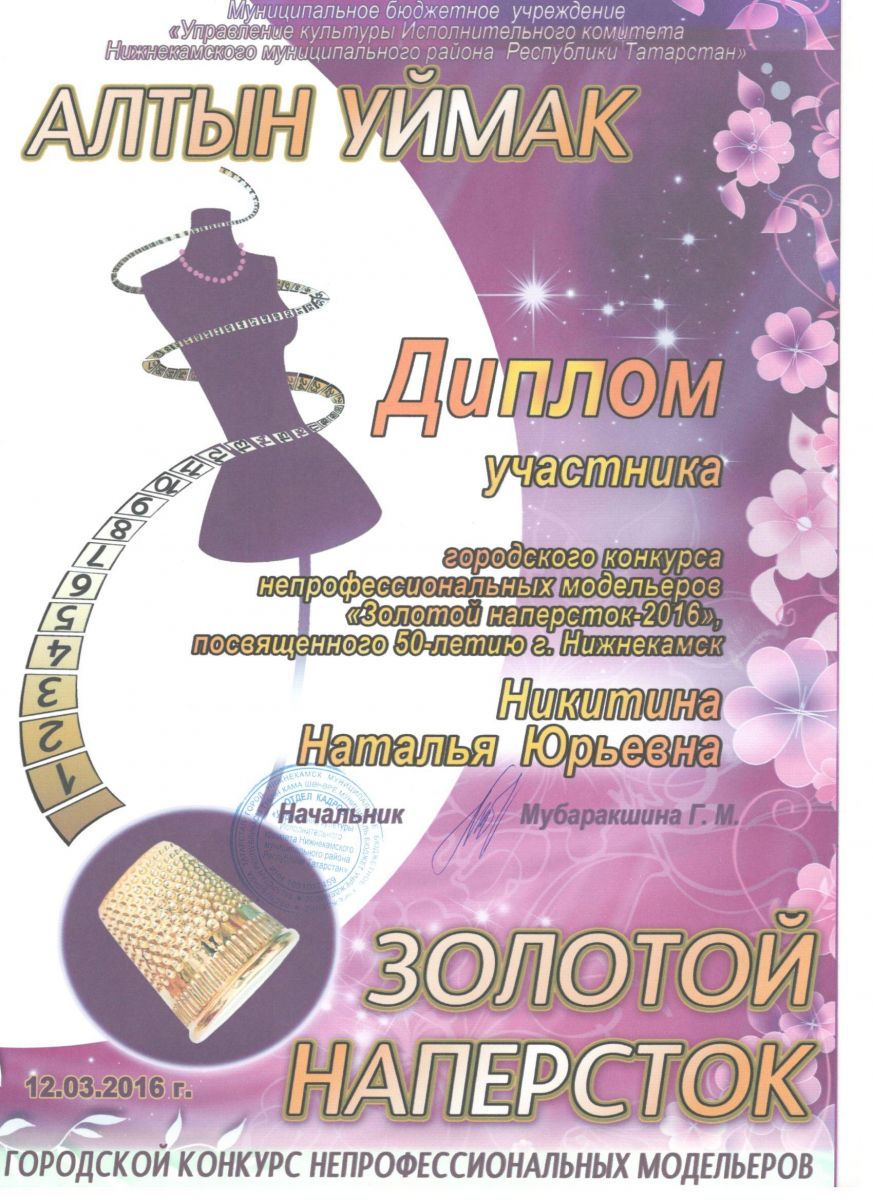 12.03.2016г. в ДК "Альфа" прошёл городской конкурс непрофессиональных модельеров "Золотой напёрсток-2016", посвящённый 50-летию г. Нижнекамска. Диплом участника был вручён кастелянше МБДОУ №94 "Соенеч", Никитиной Наталье Юрьевне.