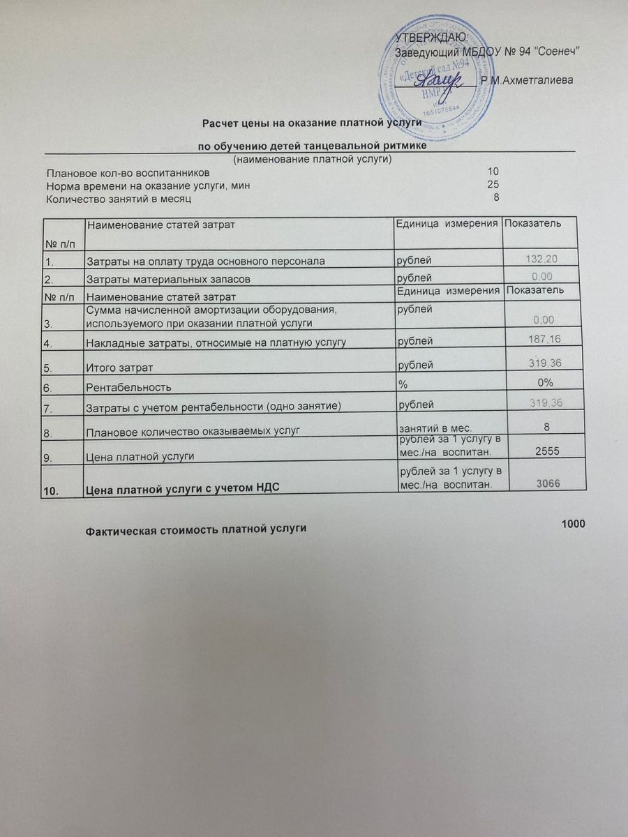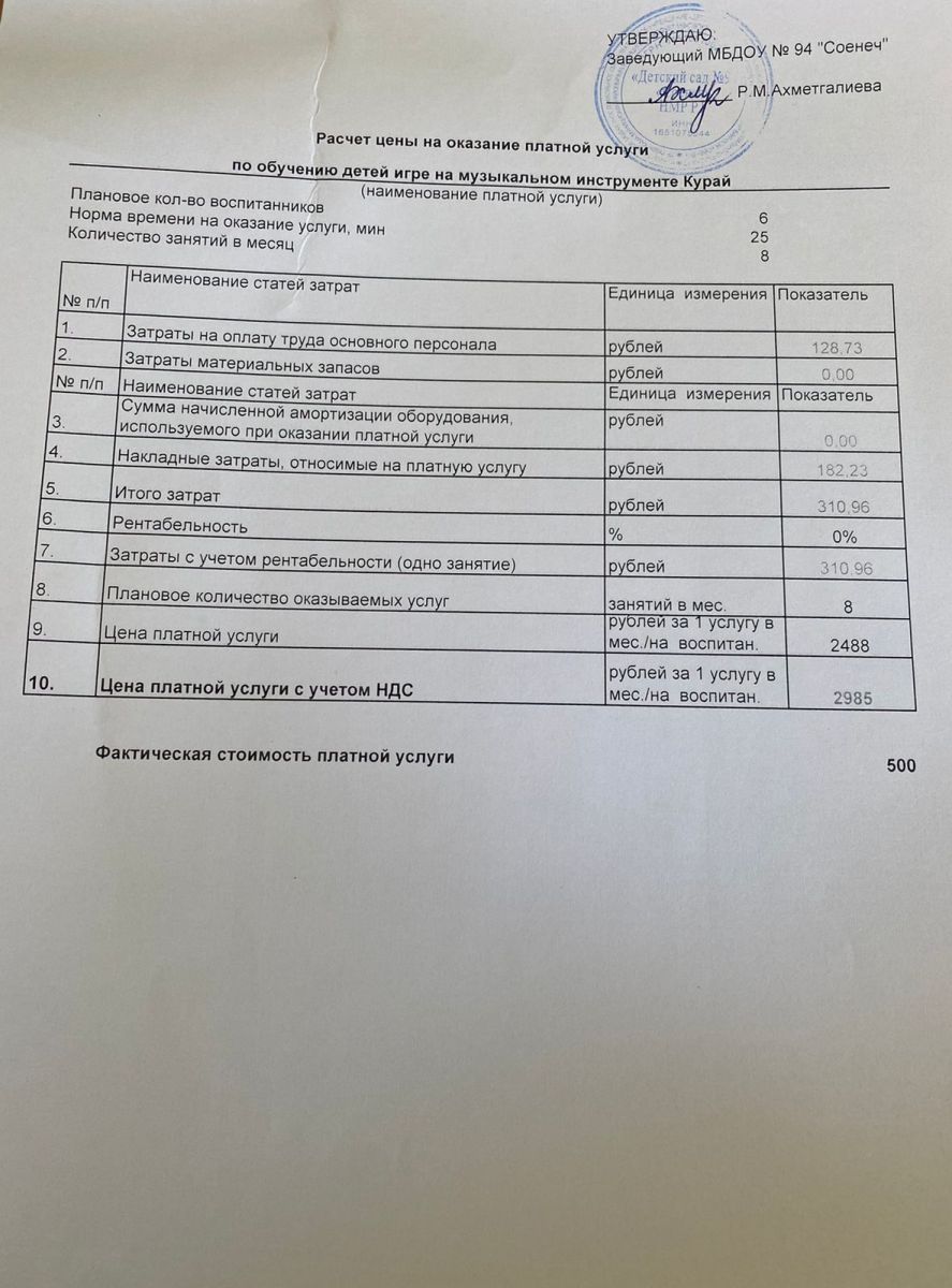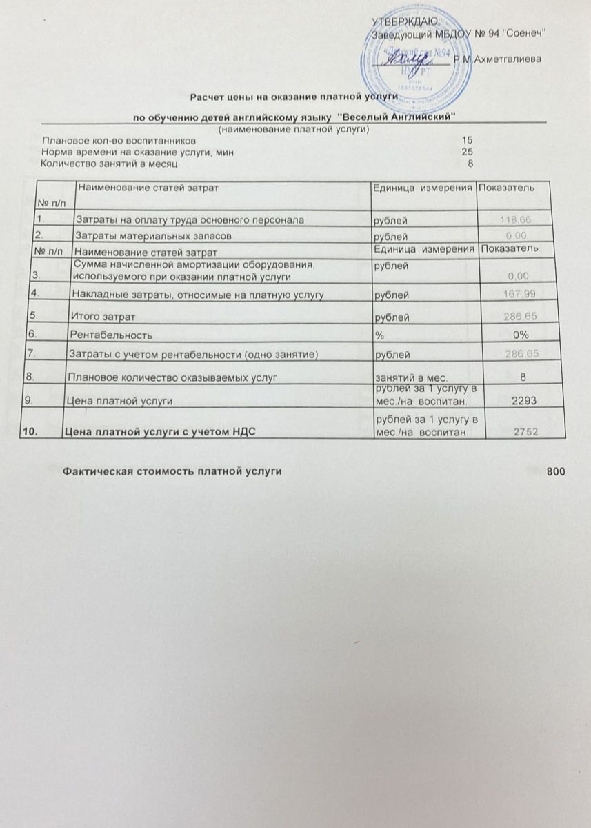 *Расчет цены на оказание платной услуги: "Юный футболист", "Умники и умницы", "Болтушки", "Вокал", "Ритмика", "Happe English", "Fanny English", "Театральна ступенька", "Курай"