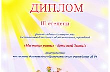 Воспитанники нашего детского сада приняли участие в Фестивале детского творчества "Мы такие разные - дети всей Земли!". Вопитанники порадовали нижнекамцев яркими танцами и были награждены дипломом 3 степени и подарками! Поздравляем коллектив детского сада, родителей и детей! Молодцы!