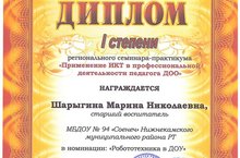 Сегодня диплом 1 степени получил старший воспитатель нашего детского сада Шарыгина М.Н. в номинации "Робототехника в ДОУ" регионального конкурса "Применение ИКТ в профессиональной деятельности педагога ДОО". Поздравляем!