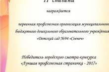 16 ноября побвели итоги городского смотра-конкурса "Лучшая профсоюзная страничка-2017". Дипломом 2 степени награждена первичная профсоюзная организация муниципального бюджетного дошкольного образовательного учреждения "Детский сад №94". Поздравляем Ерашову Марию Николаевну, председателя профкома и желаем успеха!