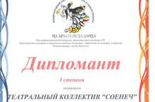 19 ноября в городе Ижевске прошел Международный конкурс-фестиваль в рамках проекта "На крыльях таланта" при информационной поддержке Министерства культуры РФ, Министерства культуры и туризма республикик Удмуртия, Управления по культуре и туризму Администрации города Ижевска. Воспитанники нашего детского сада в составе театрального коллектива "Соенеч" представили членам жюри мюзикл "Сказка на новый лад "Волк и семеро козлят". По результатам конкурса коллектив стал Дипломантом I степени. Поздравляем и желаем дальнейших творческих успехов!