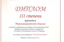 Сегодня на базе МБДОУ №13 прошел финал муниципального конкурса для воспитанников ДОУ "Маршак в рисунках и стихах", посвященный 130-летию со дня рождения поэта С.Я.Маршака. Наши воспитанники приняли активное участие в данном конкурсе. Мирзамахмутова Амалия за чтение стихотворения "Чего боялся Петя" заняла 2 место. Руководитель : Щеклеина О.А. Поздравляем!
