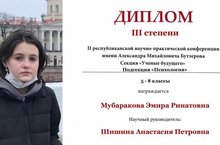 Поздравляем Мубаракову Эмиру, ученица 6а класса, и ее руководителя Анастасию Петровну с призовым местом в республиканской научно - практической конференции им. А.М. Бутлерова в секции «Психология». Желаем Эмире дальнейших побед и свершений! Поздравляем и гордимся!!!