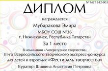 Поздравляем ученицу 6А класса Мубаракову Эмиру и ее руководителя, педагога-психолога нашей школы Шишину Анастасию Петровну с победой в III Всероссийском конкурсе для детей и взрослых "Фестиваль творчества"! Желаем вам дальнейшей плодотворной совместной работы и, конечно же, новых побед!