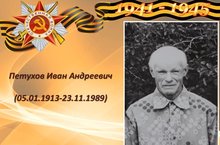 Петухов Иван Андреевич родился 5 января 1913 года в Грховском районе Удмуртии, в деревне Алексеевка. В 28 лет в 1941 г. пошел на фронт. Воевал в Крыму в пехотных войсках. Переходил Вброд озеро Сиваш в Крыму. Подорвался в бою на мине и ему осколком выбило глаз. В 1944 г. демобилизирован. Награжден орденом Великой Отечественной войны за храбрость, стойкость и мужество, проявленные в войне с немецко-фашистскими захватчиками. А также медалью за доблестный труд в Великой Отчественной войне. "Спасибо деду за Победу!" - говорит гордо Екатерина!