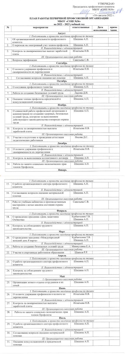 Председатель первичной профсоюзной организации - Шишина Анастасия Петровна,