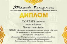 Поздравляем Гатауллину Лейлу-победительницу XV Республиканского фестиваля-конкурса « Камская мозаика», в номинации " Музыкально- теоретическая олимпиада", Лейла стала Лауреатом II степени,преподаватель Антонина Викторовна Нырова! Так держать, гордимся!