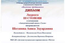 Завершился VI Международный конкурс-фестиваль вокально-хорового и музыкального творчества «Весенние проталины». Поздравляем победителей в номинации «Академический вокал»:Пророкова Софья стала Лауреатом 1степени, Усманова Элина-Лауреат1 степени,Святова Ксения-Лауреат 2степени,Мельникова София -Лауреат 2степени, Шапорева Софья -Лауреат 1 степени,Колчерина Ольга- Лауреат 3 степени,преподаватель по вокалу Сапёрова Ольга Михайловна,концертмейстер Сафина Альбина Накиповна ; Шегапова Аниса -Лауреат 3 степени,преподаватель Малиновская Ольга Николаевна, Концертмейстер Долгополова Вероника Петровна. Хоровой коллектив «Поющая акварель»-Лауреат 1 степени, руководитель Малиновская Ольга Николаевна,концертмейстер Нырова Антонина Викторовна.