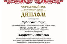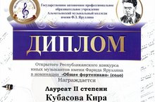 От души поздравляем победителя II Всероссийского ( с международным участием)конкурса по музыкально-теоретическим дисциплинам, посвящённого Международному дню музыки, Кубасову Киру(преподаватель Азизова Викторина Исмаиловна), ставшую Лауреатом I степени!