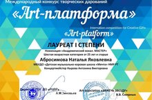 Радуемся успехам своих коллег. VII Международный конкурс творческих дарований “Art-platform” Лауреат I степени- Абросимова Наталья Яковлевна ( номинация « Академический вокал. Мастер»), Лауреат II степени Абросимова Ксения Алексеевна (номинация « Мастер.Академический вокал-Соло»), концертмейстер Нырова Антонина Викторовна. Всероссийский творческий конкурс «Конкурсплюс», преподаватель Абросимова Н.Я. награждена дипломом I степени . Благодарственными письмами отмечены преподаватели Абросимова Н.Я, Абросимова К.А., Нырова А.В Молодцы! Гордимся!