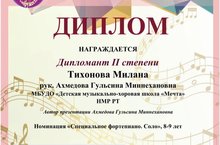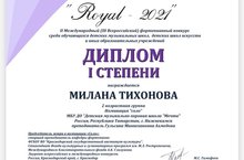 Мы рады сообщить Вам результаты участия в II Международном (III Всероссийском) фортепианном конкурсе "Royal - 2021",который проводил творческий проект "Ми Фа Соль". Поздравляем Милану Тихонову, преподаватель Гульсина Миннехановна Ахмедова, с получением Диплома I степени. Наша воспитанница успешно поучаствовали в номинации “Соло”,во второй возрастной группе( 3-4 классы), где за право победить в виртуозной игре сражались 165 участников.