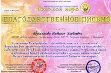 Поздравляем Абросимову Наталью Яковлевну и ее воспитанниц с победой в Международном фестивале-конкурсе « Золотая Лира» -Гаврилова Анастасия лауреат 2 степени, Гатауллина Лейла лауреат 2 степени, Фролова Варвара лауреат 3 степени, а также все эти же девочки стали лауреатами 3 степени в Международном конкурсе « Звездный дождь», гордимся и поздравляем преподавателя Кушинскую Светлану Николаевну с дипломом Победителя ( 1место) во Всероссийском конкурсе « Мелодинка. Олимпиады и публикации». Все дипломы можно посмотреть во вкладке достижений преподавателей и учащихся.