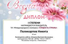 От души поздравляем преподавателя Игошину Викторию Васильевну и Поликарпова Никиту с победой в VII Международном конкурсе « Гордость страны». Данная работа прошла экспертную редакционную оценку и получила положительное заключение оргкомитета , а также Никита награждён Дипломом I степени! Гордимся, поздравляем!!!!