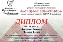 От души поздравляем Федорова Романа, воспитанника 2 класса ДМХШ "Мечта", преподавателя по развитию голоса Едомину Ларису Михайловну и концертмейстера Ахмедову Гульсину Миннехановну с победой в Международном конкурсе "Наследники великого баса".Первые робкие шаги и маленькая победа.Поздравляем!