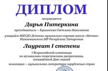 Пришли результаты I Всероссийской олимпиады по музыкально-теоретическим дисциплинам, посвященной Дню Знаний. Поздравляем Дарью Питеркину-лауреат 1 степени(преподаватель Кушинская С.Н.), Закирову Эльвину -лауреат 3 степени(преподаватель Нырова А.В.) Гордимся нашими талантливыми детьми!