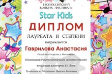Пришли результаты I Всероссийского конкурса -фестиваля STAR KID: Лейла Гатауллина- лауреат 1 степени (преподаватель Абросимова Н.Я.), Анастасия Гаврилова -лауреат 2 степени(преподаватель Абросимова Н.Я.). Виктория Никитина -лауреат 2 степени(преподаватель Кушинская С.Н.), Лукошина Екатерина -лауреат 3 степени( преподаватель Нырова А.В.) Гордимся, поздравляем!!!!
