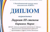Поздравляем Киршину Марию и Кубасову Киру, учениц 1 класса, преподаватель по фортепиано Сафина Альбина Накиповна, с победой в V Республиканском конкурсе юных исполнителей "Forte". Они стала Лауреатами III степени. Гордимся!