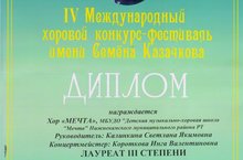 18 апреля 2015 года хор «Мечта» принял участие в IV Международном конкурсе – фестивале имени Семёна Казачкова, который проходил в городе Набережные Челны на базе Детской школы искусств и добавил в свою копилку ещё один диплом. На этот раз диплом III степени. В конкурсе приняло участие 25 хоровых коллективов и 8 вокальных ансамблей из Москвы, Ульяновска, Ижевска, Уфы, Лениногорска, Соликамска, Белезино, Набережных Челнов и Нижнекамска. Хор исполнил три произведения: П.Чесноков «Крестьянская пирушка», русская народная песня в обработке А. Козлова «Ах, ты степь широкая», В. Шаинский «Весёлая фуга» (художественный руководитель - Калинкина Светлана Якимовна, концертмейстер - Короткова Инга Валентиновна)