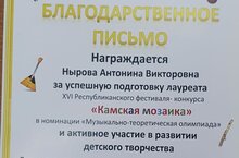 От души поздравляем победителей XVI Республиканского фестиваля-конкурса"Камская мозаика", в номинации "Музыкально-теоретическая олимпиада":Кашипову Камилю, Шуклину Ксению, Смоленкову Юлию-они стали Лауреатами 1 степени,Абдурашитову Самиру-Лауреатом 2 степени(преподаватель Нырова А.В.)