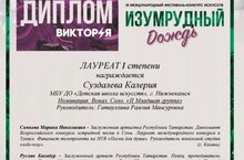 Поздравляем воспитанницу Детской школы искусств Суздалеву Калерию (преподаватель Гатауллина Рамзия Мансуровна) с победой в Международном фестивале-конкурсе искусств "Изумрудный дождь", номинация: Вокал. Соло.